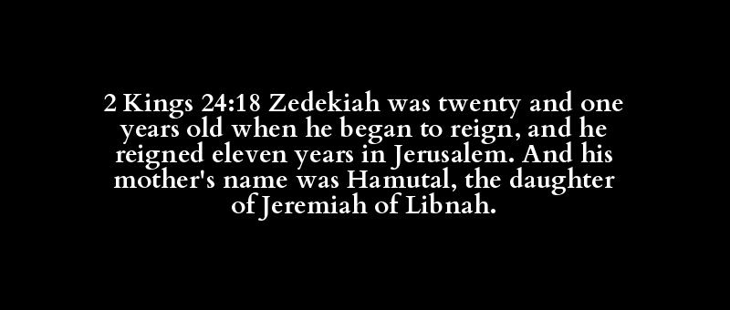 2 Kings 24:18 Zedekiah was twenty and one years old when he began to reign, and he reigned eleven years in Jerusalem. And his mother's name was Hamutal, the daughter of Jeremiah of Libnah.