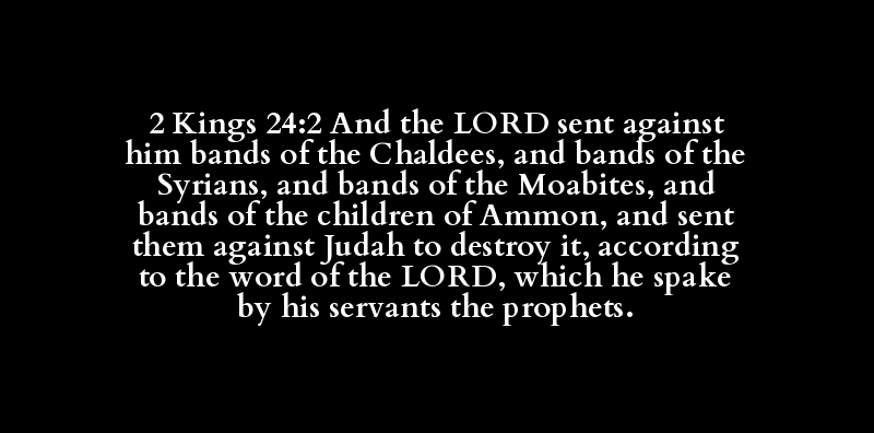 2 Kings 24:2 And the LORD sent against him bands of the Chaldees, and bands of the Syrians, and bands of the Moabites, and bands of the children of Ammon, and sent them against Judah to destroy it, according to the word of the LORD, which he spake by his servants the prophets.