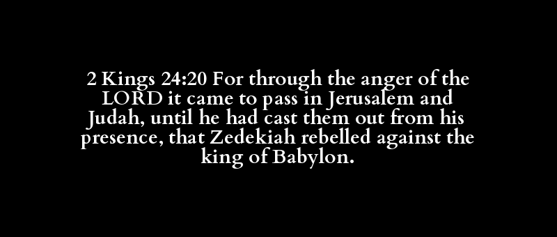 2 Kings 24:20 For through the anger of the LORD it came to pass in Jerusalem and Judah, until he had cast them out from his presence, that Zedekiah rebelled against the king of Babylon.