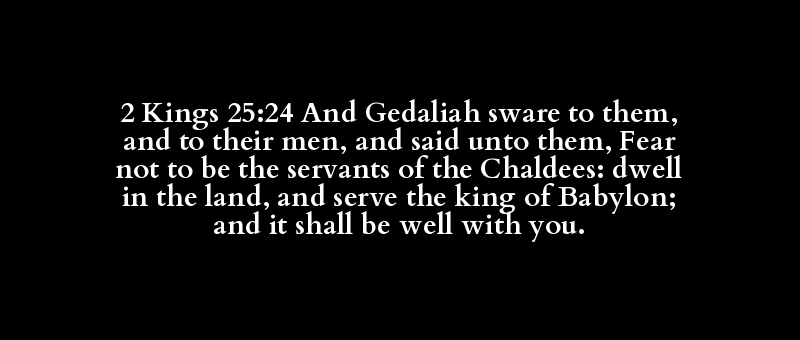 2 Kings 25:24 And Gedaliah sware to them, and to their men, and said unto them, Fear not to be the servants of the Chaldees: dwell in the land, and serve the king of Babylon; and it shall be well with you.