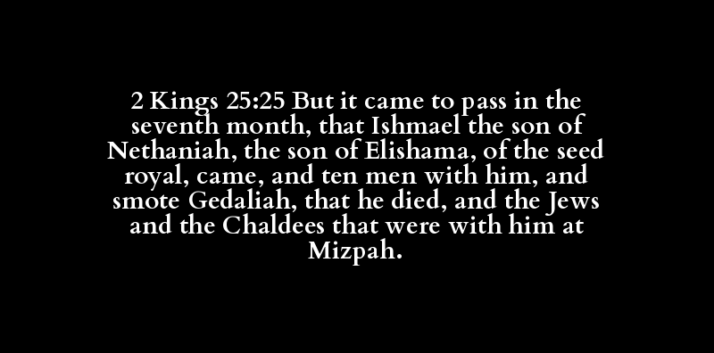 2 Kings 25:25 But it came to pass in the seventh month, that Ishmael the son of Nethaniah, the son of Elishama, of the seed royal, came, and ten men with him, and smote Gedaliah, that he died, and the Jews and the Chaldees that were with him at Mizpah.
