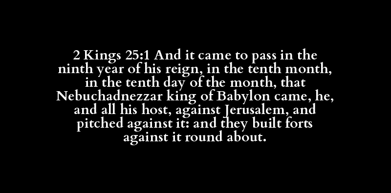 2 Kings 25:1 And it came to pass in the ninth year of his reign, in the tenth month, in the tenth day of the month, that Nebuchadnezzar king of Babylon came, he, and all his host, against Jerusalem, and pitched against it: and they built forts against it round about.