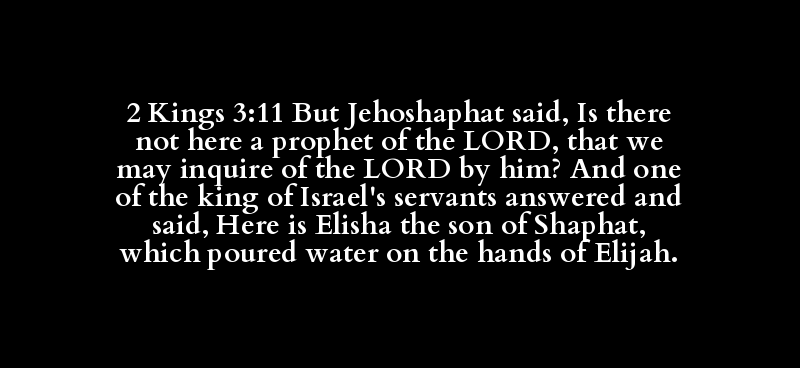 2 Kings 3:11 But Jehoshaphat said, Is there not here a prophet of the LORD, that we may inquire of the LORD by him? And one of the king of Israel's servants answered and said, Here is Elisha the son of Shaphat, which poured water on the hands of Elijah.