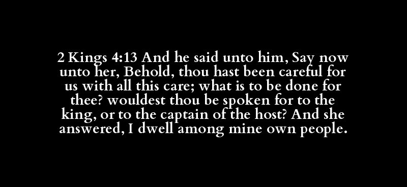 2 Kings 4:13 And he said unto him, Say now unto her, Behold, thou hast been careful for us with all this care; what is to be done for thee? wouldest thou be spoken for to the king, or to the captain of the host? And she answered, I dwell among mine own people.