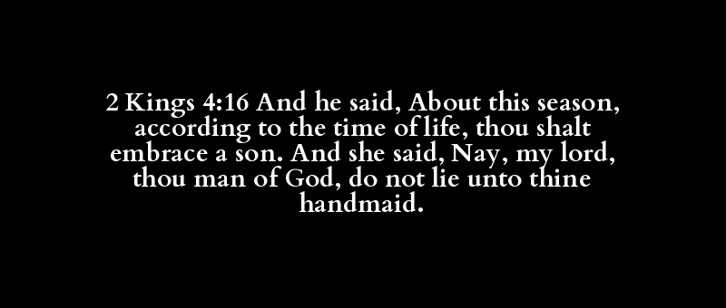 2 Kings 4:16 And he said, About this season, according to the time of life, thou shalt embrace a son. And she said, Nay, my lord, thou man of God, do not lie unto thine handmaid.
