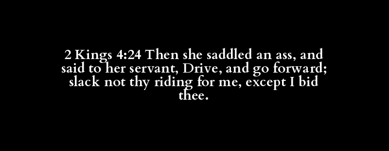 2 Kings 4:24 Then she saddled an ass, and said to her servant, Drive, and go forward; slack not thy riding for me, except I bid thee.