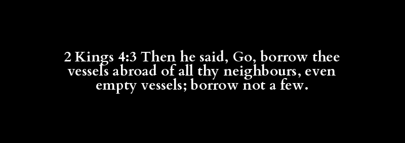 2 Kings 4:3 Then he said, Go, borrow thee vessels abroad of all thy neighbours, even empty vessels; borrow not a few.