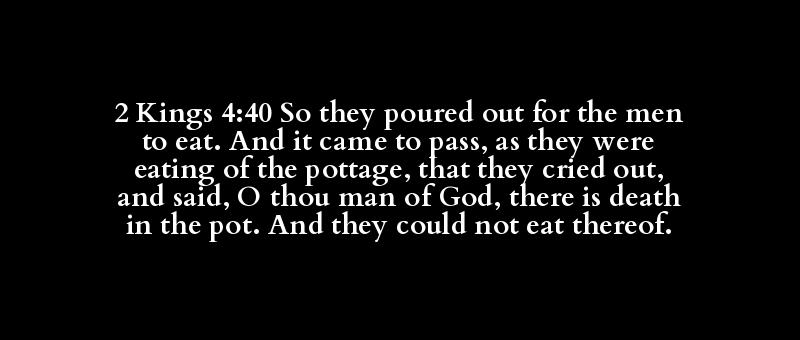 2 Kings 4:40 So they poured out for the men to eat. And it came to pass, as they were eating of the pottage, that they cried out, and said, O thou man of God, there is death in the pot. And they could not eat thereof.