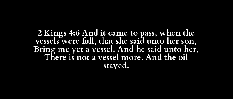 2 Kings 4:6 And it came to pass, when the vessels were full, that she said unto her son, Bring me yet a vessel. And he said unto her, There is not a vessel more. And the oil stayed.