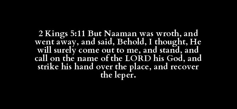 2 Kings 5:11 But Naaman was wroth, and went away, and said, Behold, I thought, He will surely come out to me, and stand, and call on the name of the LORD his God, and strike his hand over the place, and recover the leper.
