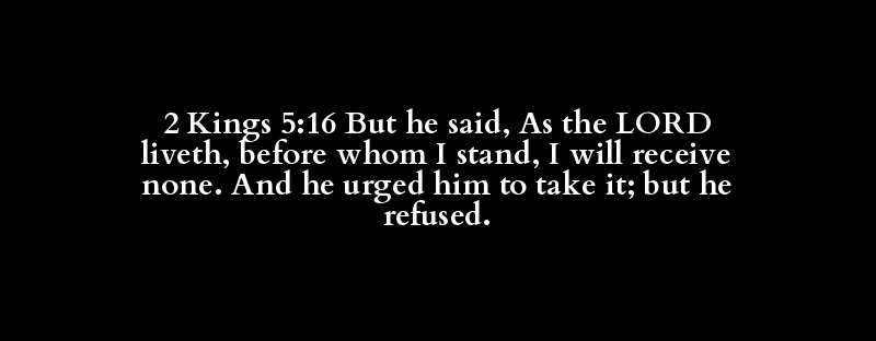 2 Kings 5:16 But he said, As the LORD liveth, before whom I stand, I will receive none. And he urged him to take it; but he refused.