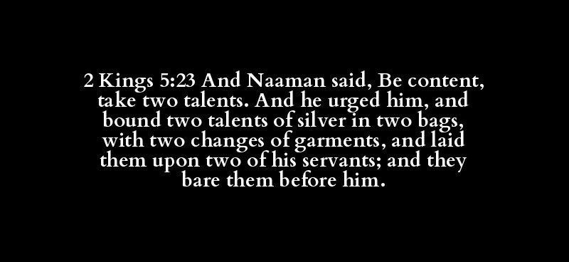 2 Kings 5:23 And Naaman said, Be content, take two talents. And he urged him, and bound two talents of silver in two bags, with two changes of garments, and laid them upon two of his servants; and they bare them before him.