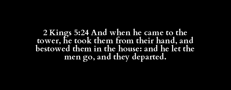2 Kings 5:24 And when he came to the tower, he took them from their hand, and bestowed them in the house: and he let the men go, and they departed.