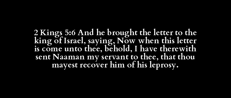 2 Kings 5:6 And he brought the letter to the king of Israel, saying, Now when this letter is come unto thee, behold, I have therewith sent Naaman my servant to thee, that thou mayest recover him of his leprosy.