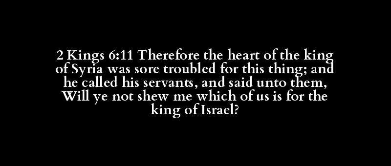 2 Kings 6:11 Therefore the heart of the king of Syria was sore troubled for this thing; and he called his servants, and said unto them, Will ye not shew me which of us is for the king of Israel?