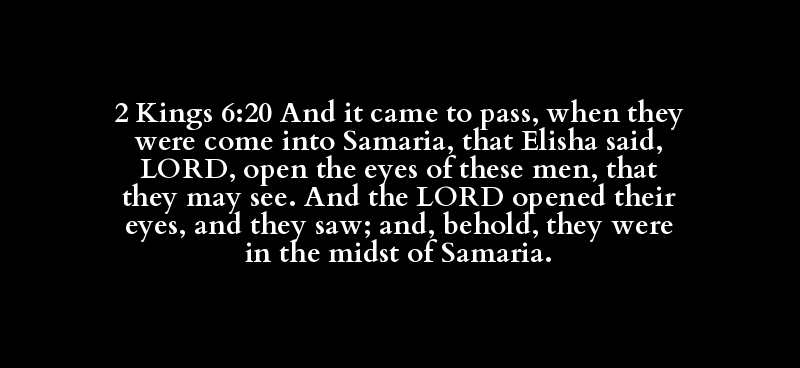 2 Kings 6:20 And it came to pass, when they were come into Samaria, that Elisha said, LORD, open the eyes of these men, that they may see. And the LORD opened their eyes, and they saw; and, behold, they were in the midst of Samaria.