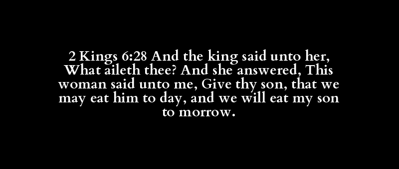 2 Kings 6:28 And the king said unto her, What aileth thee? And she answered, This woman said unto me, Give thy son, that we may eat him to day, and we will eat my son to morrow.