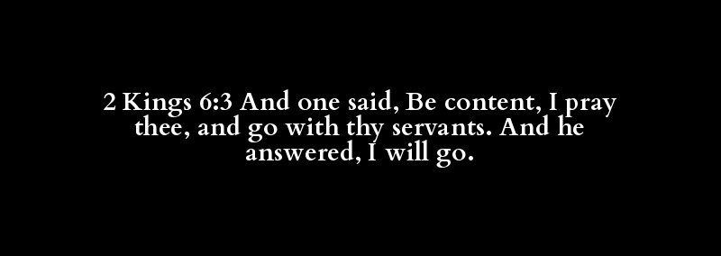2 Kings 6:3 And one said, Be content, I pray thee, and go with thy servants. And he answered, I will go.