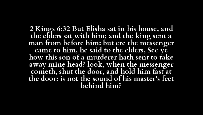 2 Kings 6:32 But Elisha sat in his house, and the elders sat with him; and the king sent a man from before him: but ere the messenger came to him, he said to the elders, See ye how this son of a murderer hath sent to take away mine head? look, when the messenger cometh, shut the door, and hold him fast at the door: is not the sound of his master's feet behind him?