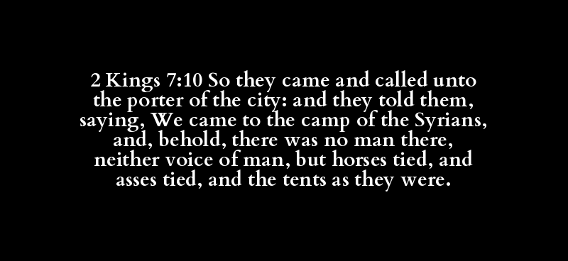 2 Kings 7:10 So they came and called unto the porter of the city: and they told them, saying, We came to the camp of the Syrians, and, behold, there was no man there, neither voice of man, but horses tied, and asses tied, and the tents as they were.