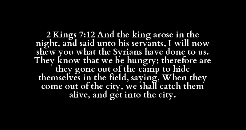 2 Kings 7:12 And the king arose in the night, and said unto his servants, I will now shew you what the Syrians have done to us. They know that we be hungry; therefore are they gone out of the camp to hide themselves in the field, saying, When they come out of the city, we shall catch them alive, and get into the city.