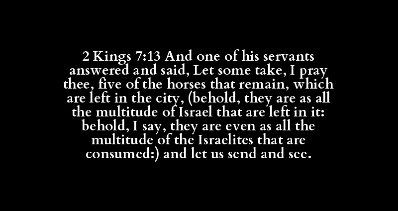 2 Kings 7:13 And one of his servants answered and said, Let some take, I pray thee, five of the horses that remain, which are left in the city, (behold, they are as all the multitude of Israel that are left in it: behold, I say, they are even as all the multitude of the Israelites that are consumed:) and let us send and see.