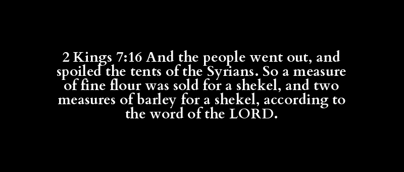 2 Kings 7:16 And the people went out, and spoiled the tents of the Syrians. So a measure of fine flour was sold for a shekel, and two measures of barley for a shekel, according to the word of the LORD.