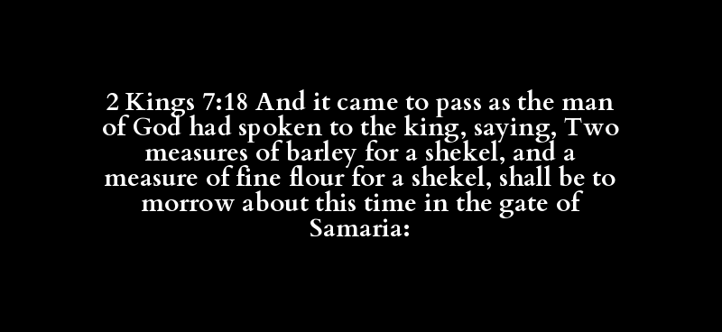 2 Kings 7:18 And it came to pass as the man of God had spoken to the king, saying, Two measures of barley for a shekel, and a measure of fine flour for a shekel, shall be to morrow about this time in the gate of Samaria: