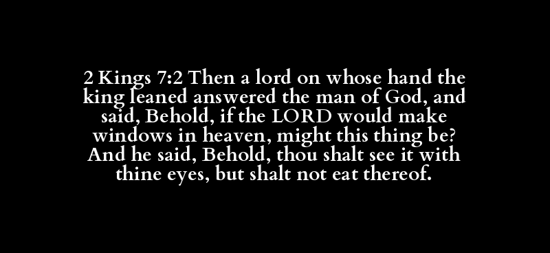 2 Kings 7:2 Then a lord on whose hand the king leaned answered the man of God, and said, Behold, if the LORD would make windows in heaven, might this thing be? And he said, Behold, thou shalt see it with thine eyes, but shalt not eat thereof.
