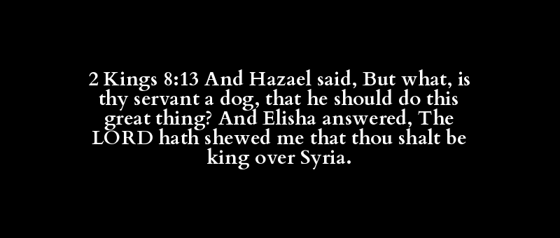 2 Kings 8:13 And Hazael said, But what, is thy servant a dog, that he should do this great thing? And Elisha answered, The LORD hath shewed me that thou shalt be king over Syria.