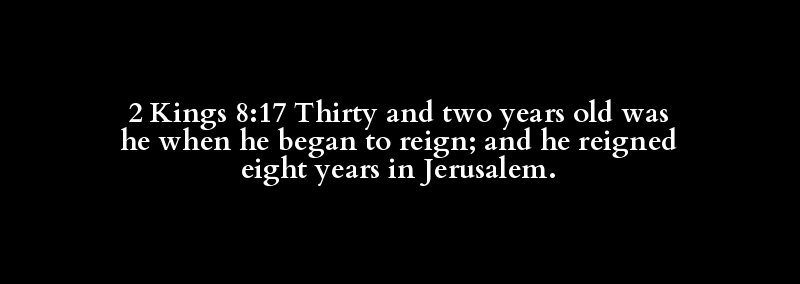 2 Kings 8:17 Thirty and two years old was he when he began to reign; and he reigned eight years in Jerusalem.
