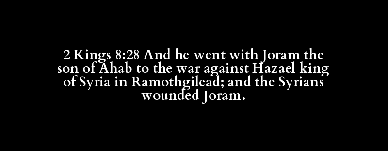2 Kings 8:28 And he went with Joram the son of Ahab to the war against Hazael king of Syria in Ramothgilead; and the Syrians wounded Joram.