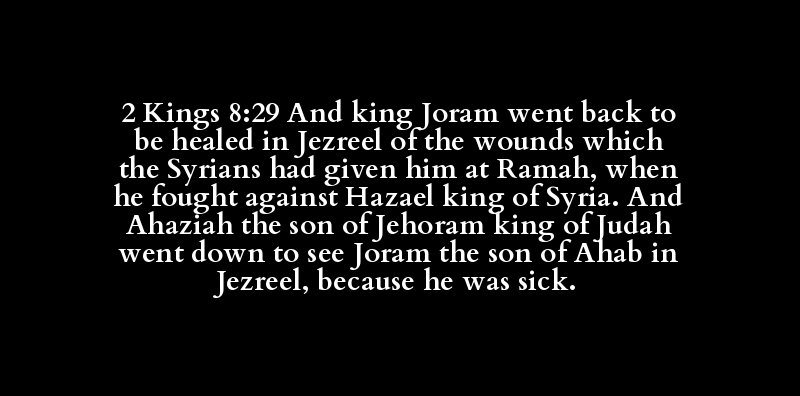 2 Kings 8:29 And king Joram went back to be healed in Jezreel of the wounds which the Syrians had given him at Ramah, when he fought against Hazael king of Syria. And Ahaziah the son of Jehoram king of Judah went down to see Joram the son of Ahab in Jezreel, because he was sick.