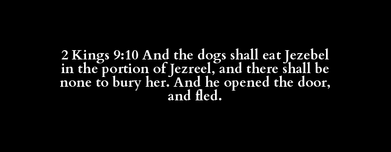 2 Kings 9:10 And the dogs shall eat Jezebel in the portion of Jezreel, and there shall be none to bury her. And he opened the door, and fled.