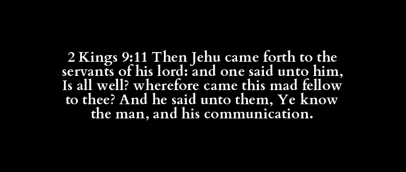 2 Kings 9:11 Then Jehu came forth to the servants of his lord: and one said unto him, Is all well? wherefore came this mad fellow to thee? And he said unto them, Ye know the man, and his communication.