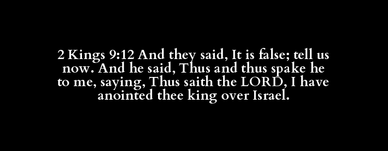 2 Kings 9:12 And they said, It is false; tell us now. And he said, Thus and thus spake he to me, saying, Thus saith the LORD, I have anointed thee king over Israel.