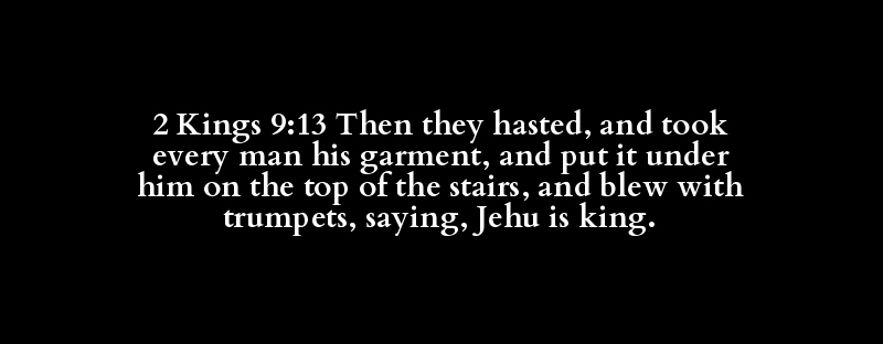 2 Kings 9:13 Then they hasted, and took every man his garment, and put it under him on the top of the stairs, and blew with trumpets, saying, Jehu is king.