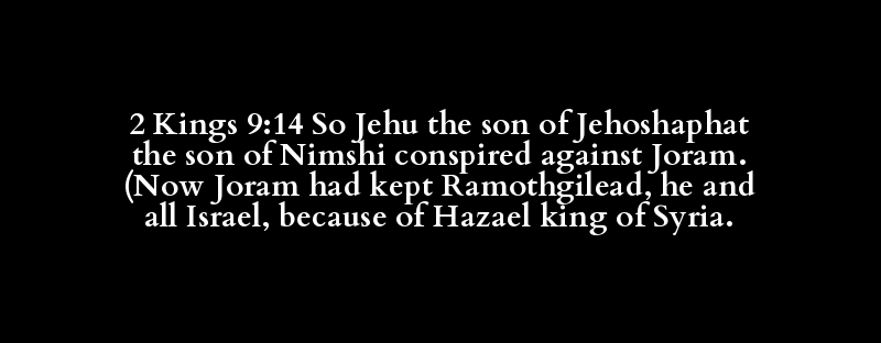 2 Kings 9:14 So Jehu the son of Jehoshaphat the son of Nimshi conspired against Joram. (Now Joram had kept Ramothgilead, he and all Israel, because of Hazael king of Syria.