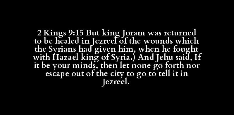 2 Kings 9:15 But king Joram was returned to be healed in Jezreel of the wounds which the Syrians had given him, when he fought with Hazael king of Syria.) And Jehu said, If it be your minds, then let none go forth nor escape out of the city to go to tell it in Jezreel.