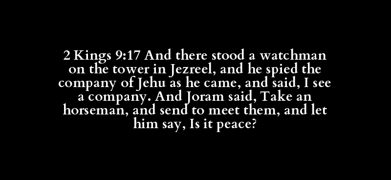 2 Kings 9:17 And there stood a watchman on the tower in Jezreel, and he spied the company of Jehu as he came, and said, I see a company. And Joram said, Take an horseman, and send to meet them, and let him say, Is it peace?