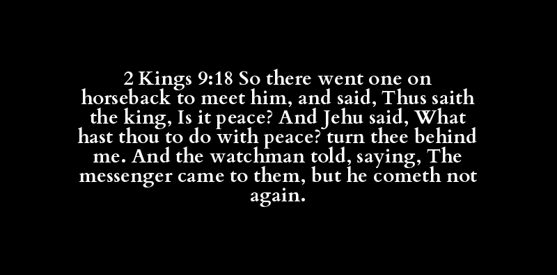 2 Kings 9:18 So there went one on horseback to meet him, and said, Thus saith the king, Is it peace? And Jehu said, What hast thou to do with peace? turn thee behind me. And the watchman told, saying, The messenger came to them, but he cometh not again.