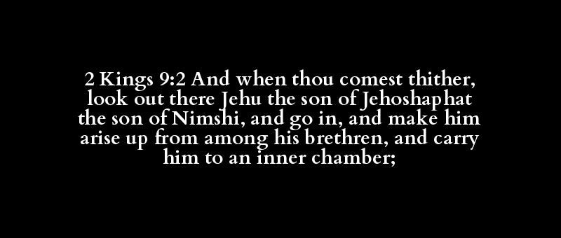 2 Kings 9:2 And when thou comest thither, look out there Jehu the son of Jehoshaphat the son of Nimshi, and go in, and make him arise up from among his brethren, and carry him to an inner chamber;