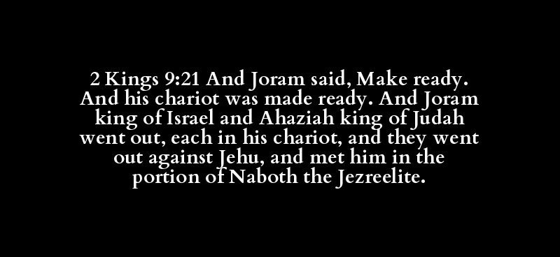 2 Kings 9:21 And Joram said, Make ready. And his chariot was made ready. And Joram king of Israel and Ahaziah king of Judah went out, each in his chariot, and they went out against Jehu, and met him in the portion of Naboth the Jezreelite.