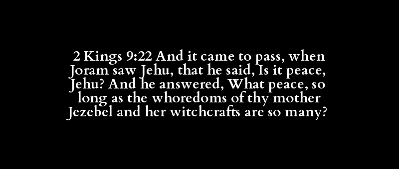 2 Kings 9:22 And it came to pass, when Joram saw Jehu, that he said, Is it peace, Jehu? And he answered, What peace, so long as the whoredoms of thy mother Jezebel and her witchcrafts are so many?