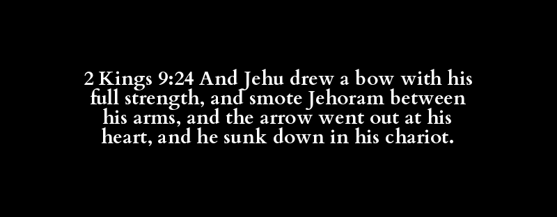 2 Kings 9:24 And Jehu drew a bow with his full strength, and smote Jehoram between his arms, and the arrow went out at his heart, and he sunk down in his chariot.