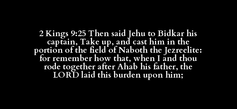2 Kings 9:25 Then said Jehu to Bidkar his captain, Take up, and cast him in the portion of the field of Naboth the Jezreelite: for remember how that, when I and thou rode together after Ahab his father, the LORD laid this burden upon him;