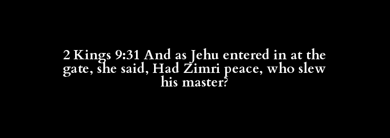 2 Kings 9:31 And as Jehu entered in at the gate, she said, Had Zimri peace, who slew his master?