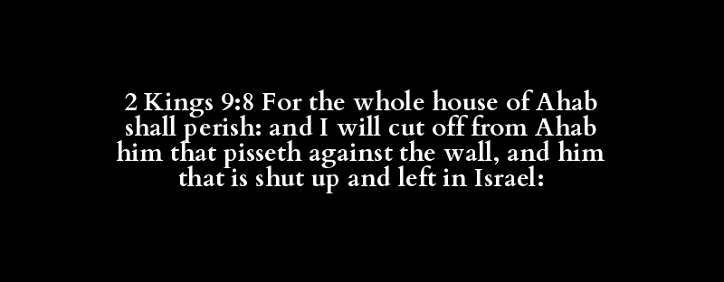 2 Kings 9:8 For the whole house of Ahab shall perish: and I will cut off from Ahab him that pisseth against the wall, and him that is shut up and left in Israel: