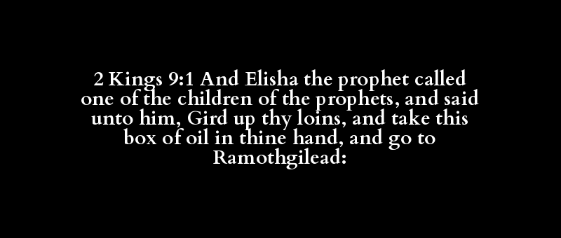 2 Kings 9:1 And Elisha the prophet called one of the children of the prophets, and said unto him, Gird up thy loins, and take this box of oil in thine hand, and go to Ramothgilead: