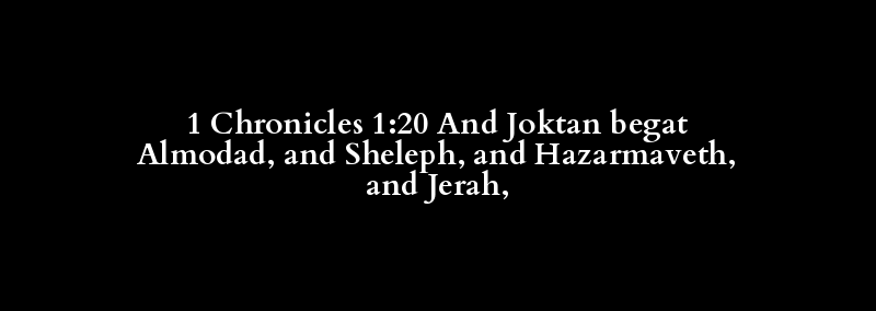 1 Chronicles 1:20 And Joktan begat Almodad, and Sheleph, and Hazarmaveth, and Jerah,